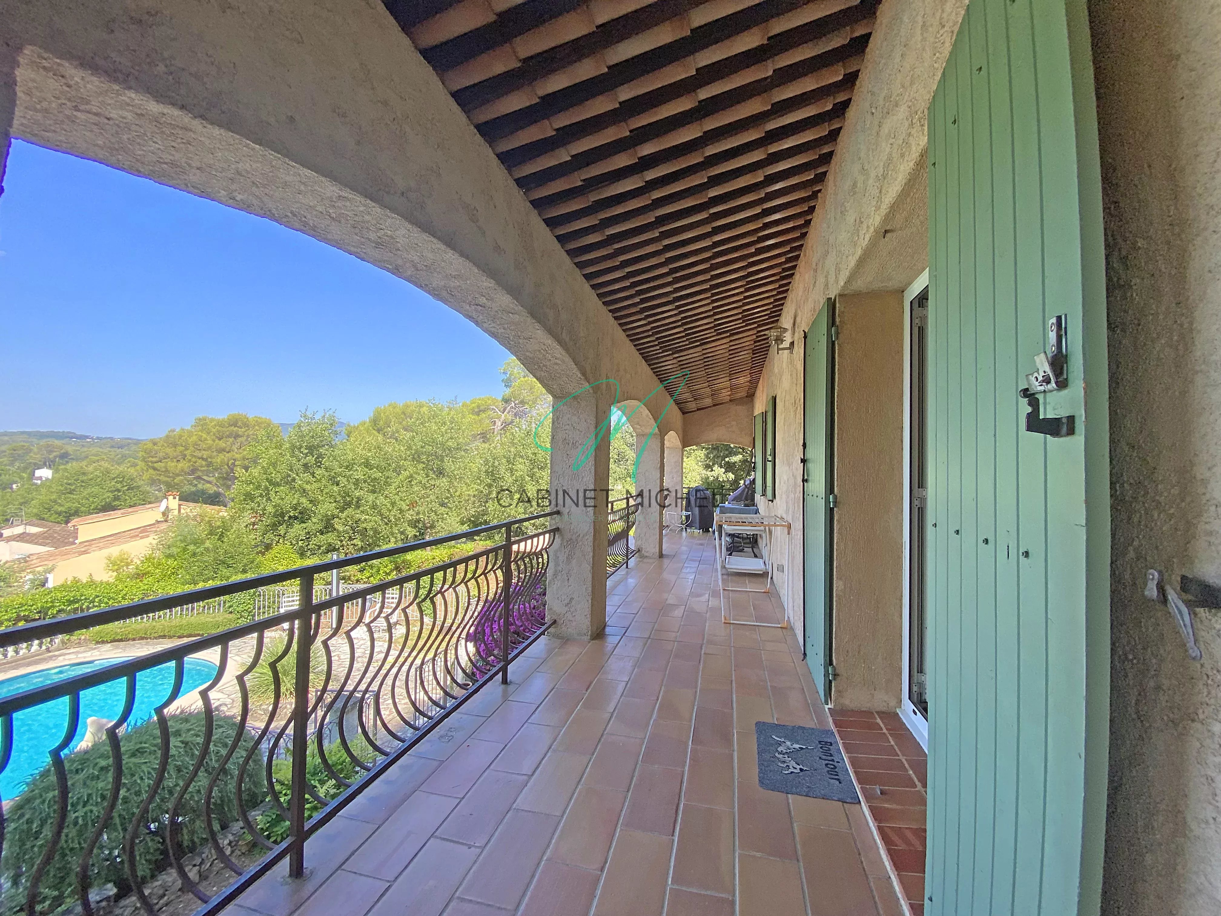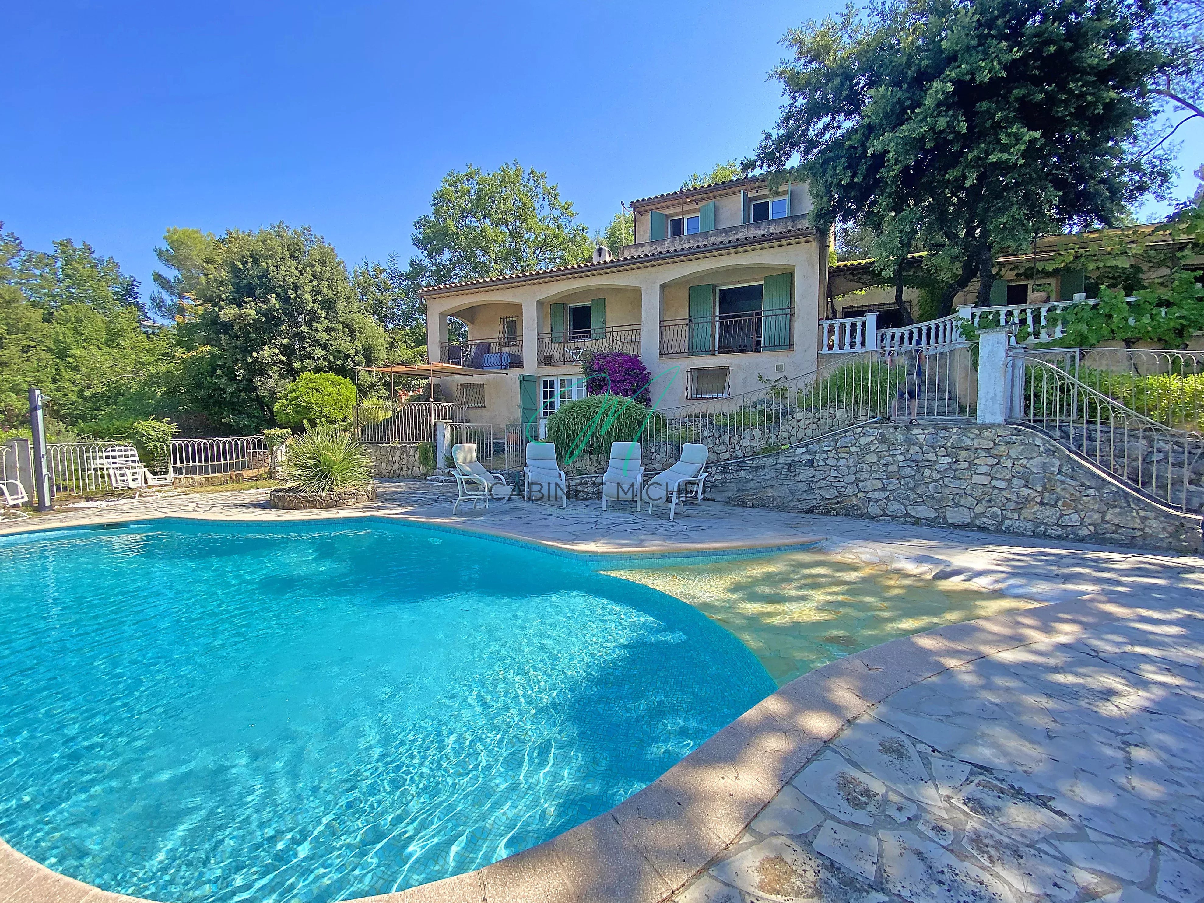 L’extérieur offre un terrain en pente douce d’environ 2 000 m², agrémenté d’une piscine, d’un garage, d’un abri jardin et d’un abri pour deux voitures.